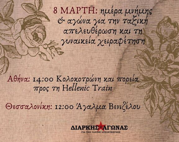 Η 8η Μάρτη δεν αποτελεί μια ημέρα γιορτής αφιερωμένη στη γυναίκα, ως ένα παθητικό υποκείμενο που οι διεκδικήσεις του κινούνται στα στενά πλαίσια που το κεφάλαιο επιβάλει ανάλογα κάθε φορά με τις ανάγκες του. Αποτελεί ημέρα αφιερωμένη στους γυναικείους αγώνες για χειραφέτηση και ικανοποίηση των αναγκών της τάξης μας. Αποτελεί μια ημέρα αφιερωμένη ενάντια σε κάθε μορφή έμφυλης καταπίεσης, η οποία εκκινεί από και εντείνει την ταξική καταπίεση και βία.
