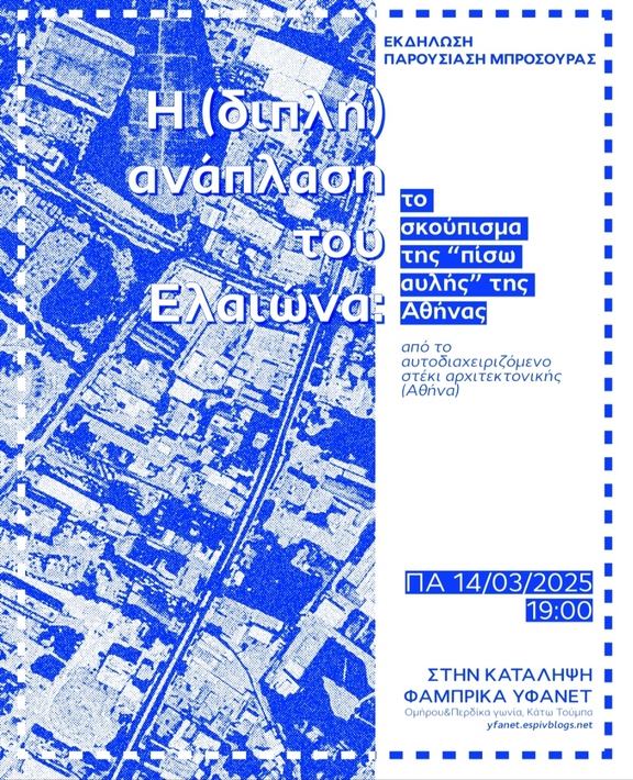 (Αναβάλλεται) Εκδήλωση-Παρουσίαση μπροσούρας: Η (διπλή) ανάπλαση του Ελαιώνα