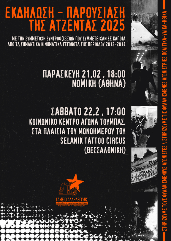 Το Ταμειο Αλληλεγγύης Φυλακισμένων και Διωκόμενων Αγωνιστών/στριών πιστό στην καταγραφή της εγχώριας κινηματικής ιστορίας στην ετήσια έκδοση της ατζέντας του, επιχειρεί και φέτος το δύσκολο έργο της καταγραφής μιας περιόδου της ιστορίας του ριζοσπαστικού επαναστατικού κινήματος. Η περίοδος που καταπιάστηκε το ταμείο φέτος είναι η διετία 2013-2014. Οπως κάθε χρόνο έτσι και φέτος θα γίνει παρουσίαση της Ατζέντας τις θεματικές της οποίας θα εμπλουτίσουν συντρόφοι και συντρόφισσες που συμμετείχαν στα γεγονότα εκείνης της περιόδου.