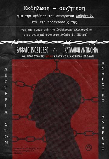 Στην συζήτηση θα συμμετέχει η Συνέλευση Αλληλεγγύης στον αναρχικό σύντροφο Ανδρέα Φ. από την Πάτρα.