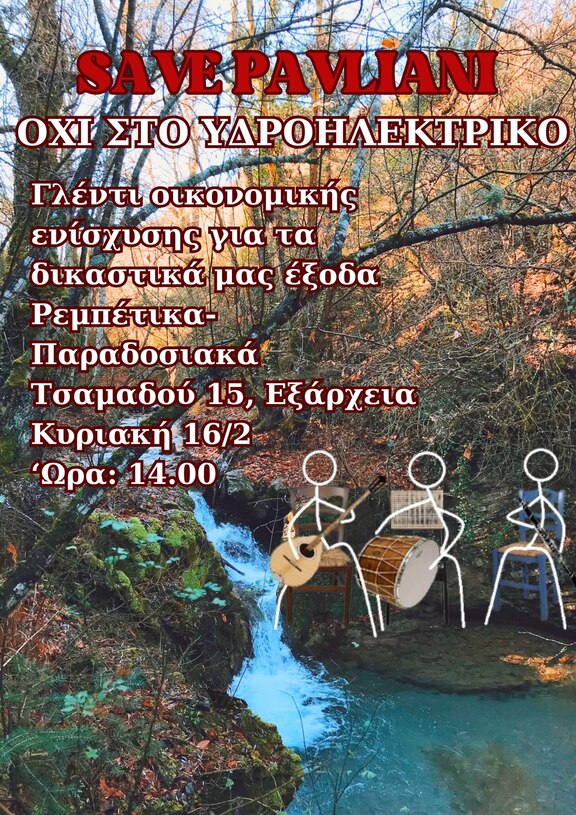 Συνεχίζουμε τον αγώνα μας ενάντια στην κατασκευή του μικρού υδροηλεκτρικού σταθμού στην Παύλιανη, που απειλεί το φυσικό περιβάλλον της περιοχής. Για να στηρίξουμε τα δικαστικά έξοδα, σας καλούμε σε ένα γλέντι οικονομικής ενίσχυσης!