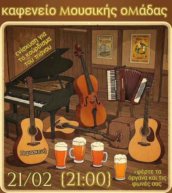 Παρασκευή 21/02 η Μουσική Ομάδα του Σχολείου διοργανώνει ακόμα ένα μουσικό καφενείο, ανοιχτό προς το κοινό, αλλά και σε άτομα που θέλουν να συμμετέχουν με τα όργανα ή/και τις φωνές τους.