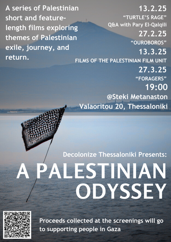 This is the fourth event in the "Palestinian Odyssey" series, exploring themes of Palestinian exile, journey and return through cinema. Through bi-weekly screenings at Steki Metanaston, the series will consider how Palestinian documentarians and experimental filmmakers have navigated states of exile, forced and imagined journeys and the right to return.