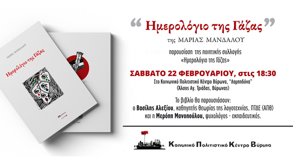 Το Κοινωνικό Πολιτιστικό Κέντρο Βύρωνα σας καλεί το Σάββατο 22/2/25 στις 6.30μμ στη Λαμπηδόνα (Άλσος Αγίας Τριάδας - Βύρωνας). Θα γίνει παρουσίαση της ποιητικής συλλογής της Μαρίας Μανδάλου "Ημερολόγιο της Γάζας".