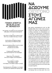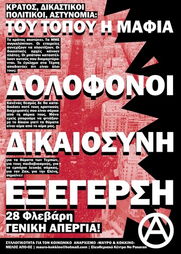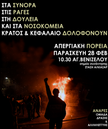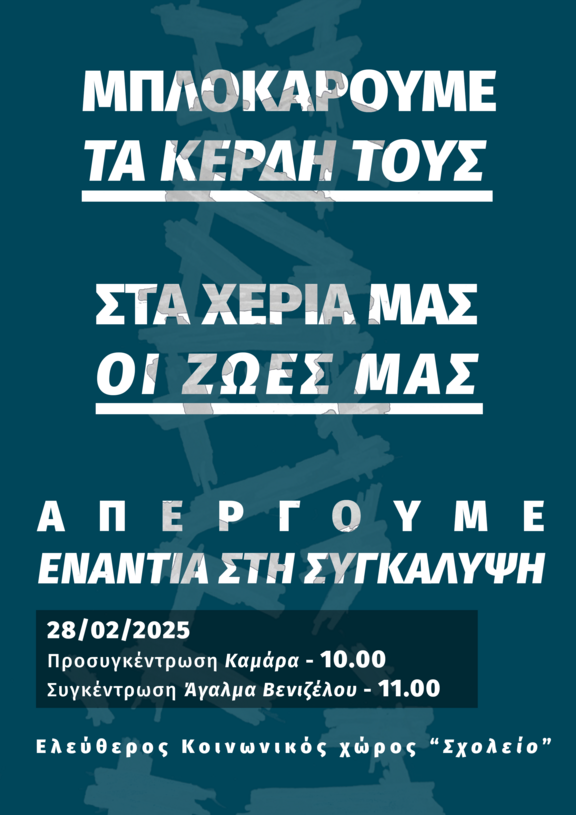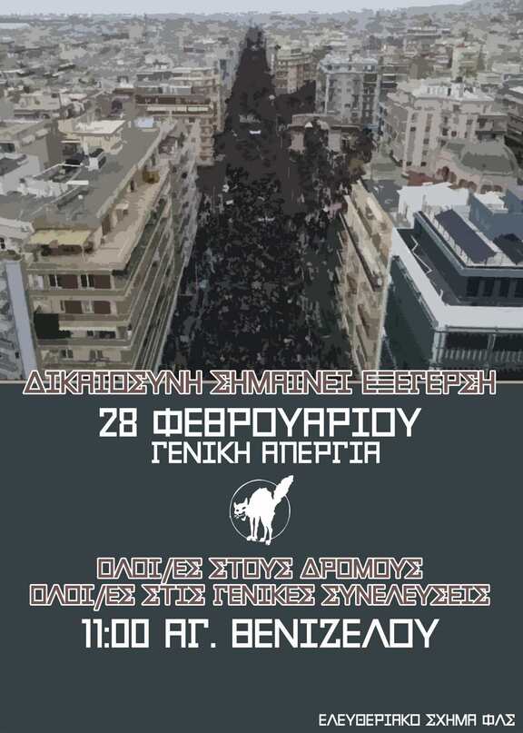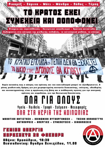 28 Φλεβάρη απεργούμε. Απεργούμε γιατί 57 άνθρωποι της δικής μας τάξης δολοφονήθηκαν για το κέρδος. Απεργούμε επειδή εκτός από το "κράτος και τον καπιταλισμό", δικός μας καθημερινός εχθρός είναι το αφεντικό μας και η μισθωτή σκλαβιά στην οποία μας υποβάλλει. Απεργούμε για να προτάξουμε την οργανωμένη συλλογική μας αντίστασή που θα τα πάρει όλα πίσω και ακόμα παραπάνω. Απεργούμε γιατί έχουμε σιχαθεί το σύστημα αυτό το οποίο γεννά μόνο εκμετάλλευση, καταπίεση,πολέμους και ατυχήματα, με χρωματιστά περιτυλίγματα προόδου και δημοκρατίας.