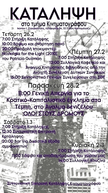 Δεν αποτελούμαστε η εξαίρεση απέναντι στην καπιταλιστική κυριαρχία που υποτιμά τους όρους διαβίωσης μας, της εργασίας μας και των σπουδών μας, για αυτό απέναντι σε αυτό το αξιακό σύστημα του κράτους και του καπιταλισμού ''ΤΑ ΚΕΡΔΗ ΤΟΥΣ ΠΑΝΩ ΑΠΟ ΤΙΣ ΑΝΘΡΩΠΙΝΕΣ ΖΩΕΣ'' '' 'Η ΕΜΕΙΣ Ή ΑΥΤΟΙ'' να γεμίσουμε τους δρόμους, τα αμφιθέατρα των Γενικών Συνελεύσεων, να κάνουμε Κατάληψη στις σχολές μας για να τις μετατρέψουμε σε Κέντρα Αγώνα.