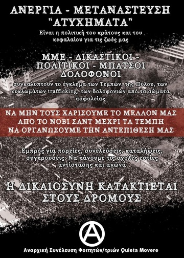 Το έγκλημα στα Τέμπη και η συγκάλυψη των πραγματικών ενόχων δεν είναι εξαίρεση για το σύστημα. Όπως και οι δολοφονίες μεταναστριών στα σύνορα αναφέρονται ως "εθνική άμυνα", τα εργατικά "ατυχήματα" ως ατομική ευθύνη των εργαζομένων, η σύμπραξη στη γενοκτονία της Παλαιστίνης ως "σοφή εξωτερική πολιτική", το σύστημα έχει στο DNA του τη διγλωσσία και την μετάθεση ευθυνών από το θύτη στο θύμα. Στην πραγματικότητα το ελληνικό κράτος είναι ένα κράτος που συγκροτείται γύρω από την εξαίρεση, την εγκληματική αμέλεια και τελικά τις δολοφονίες ανθρώπων που δεν χωρούν στην βιτρίνα των άριστων και υπάκουων εργαζομένων που επιδιώκουν. Από την δολοφονία 600+ μεταναστ(ρι)ών στην Πϋλο ως τα πογκρόμ εναντίον Ρομά, η απόσταση για την απόλυτη αδιαφορία και τη μέγιστη κερδοφορία από τις μετακινήσεις μέχρι τα νοσοκομεία, όσο αφορά τους φτωχούς, δεν είναι και τόσο μεγάλη όσο μπορεί να φαίνεται. Το έγκλημα στα Τέμπη το αποδεικνύει με πικρό τρόπο. Οι ζωές των ανθρώπων έχουν αξία για το κράτος μόνο ως πηγές παραγωγικότητας και κερδοφορίας. Απέναντι σε αυτή την πραγματικότητα είναι επιτακτικής σημασίας να δούμε τους αγώνες ενάντια στο έγκλημα των Τεμπών, την αλληλεγγύη στους μετανάστες και την αντίσταση στις αποικιοκρατικές πολιτικές ως ενιαίους σκοπούς.