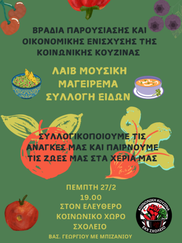 Βραδιά Παρουσίασης, Οικονομικής Ενίσχυσης & Live της Κοινωνικής Κουζίνας του Ελεύθερου Κοινωνικού Χώρου Σχολείο