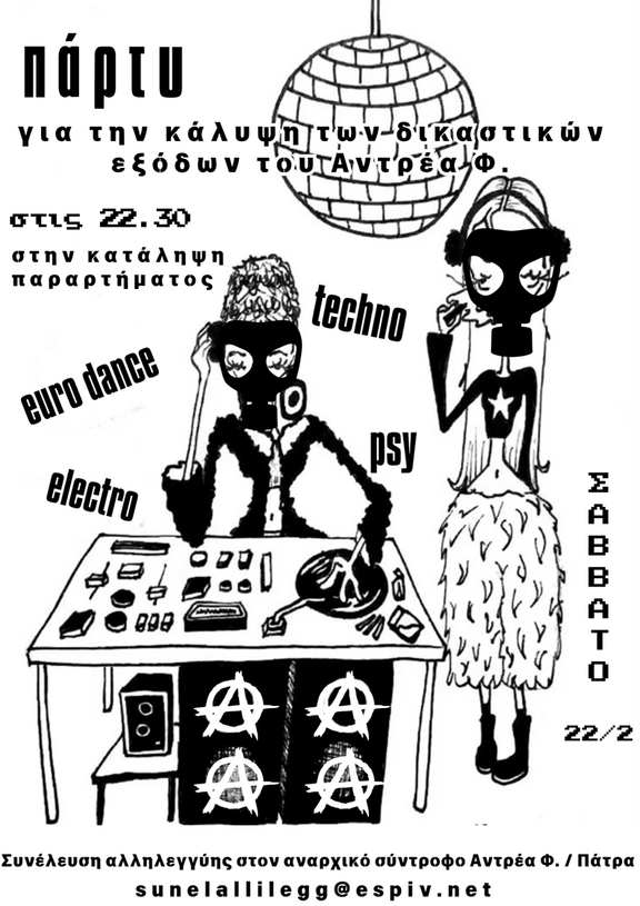 Η αιχμαλωσία αυτή κρύβει στον πυρήνα της ένα ολόκληρο στρατηγικό σχέδιο του κράτους, που απέναντί του τοποθετεί όποια αγωνίζεται για το γκρέμισμα του κόσμου της εξουσίας και τη δημιουργία εκείνου της αλληλεγγύης, της αντίστασης, της αλληλοβοήθειας και της αυτοοργάνωσης. Το σχήμα είναι απλό. Κάθε φωνή αντίστασης θα πνιγεί πάση θυσία, κάθε αγωνιστής θα φιμωθεί και θα πεταχτεί -αν περισσεύει ή αν ενοχλεί πολύ- στα μπουντρούμια της δημοκρατίας και όποιο τολμάει να σηκώσει κεφάλι, μη ακολουθώντας πειθήνια ό,τι ορίζει η κυριαρχία, θα τσακίζεται. Έτσι, λοιπόν και ο Α.Φ. είναι έγκλειστος για την πολιτική του δράση, γιατί επί σειρά δεκαετιών βρίσκεται αδιάκοπα στους αγώνες παλεύοντας για ελευθερία και αξιοπρέπεια. Από τις φοιτητικές κινητοποιήσεις του 2006-2007 και την αλληλεγγύη στους μετανάστες/τριες, στην εξέγερση του 2008 και το καταληψιακό κίνημα της Πάτρας, από τους Αγανακτισμένους και τις λαϊκές συνελεύσεις γειτονιάς, στην αλληλεγγύη στους διωκόμενους/ες αγωνιστές/τριες και τον αντιφασιστικό αγώνα, από τις κινητοποιήσεις ενάντια στα μνημόνια και τις απεργίες, στις δομές αλληλοβοήθειας και τις συλλογικές κουζίνες, από τους αγώνες ενάντια στην λεηλασία της φύσης και των ζωών μας στις ανοιχτές συνελεύσεις και τις εργατικές ομάδες, από πρωτοβουλίες ενάντια στην ακρίβεια και συνελεύσεις ενάντια στις εξορύξεις, σε πρωτοβουλίες που είχαν ως στόχο την υποστήριξη συνανθρώπων μας που είχαν πληγεί από φωτιές ή πλημμύρες και την κρατική αδιαφορία. Ο Αντρέας, ένας αναρχικός κοινωνικός αγωνιστής, συνειδητά έχει επιλέξει τον δρόμο του αγώνα στο πλάι των αδικημένων αυτού του κόσμου, του αγώνα ενάντια στην εκμετάλλευση, ενάντια στους καταστροφικούς σχεδιασμούς του κράτους και του κεφαλαίου, με την αντίσταση, την αυτοοργάνωση και την αλληλεγγύη ως όπλο. Η δίωξη του είναι πολιτική και έρχεται να προστεθεί στις τόσες εκδικητικές διώξεις αγωνιστών που στάθηκαν και στέκονται απέναντι στον κόσμο της εξουσίας.