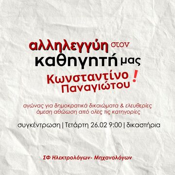 ΟΛΟΙ/ΕΣ ΣΤΑ ΔΙΚΑΣΤΗΡΙΑ 26/2 ΣΤΙΣ 11ΠΜ! Να αθωωθεί ο καθηγητής μας, Κ. Παναγιώτου!