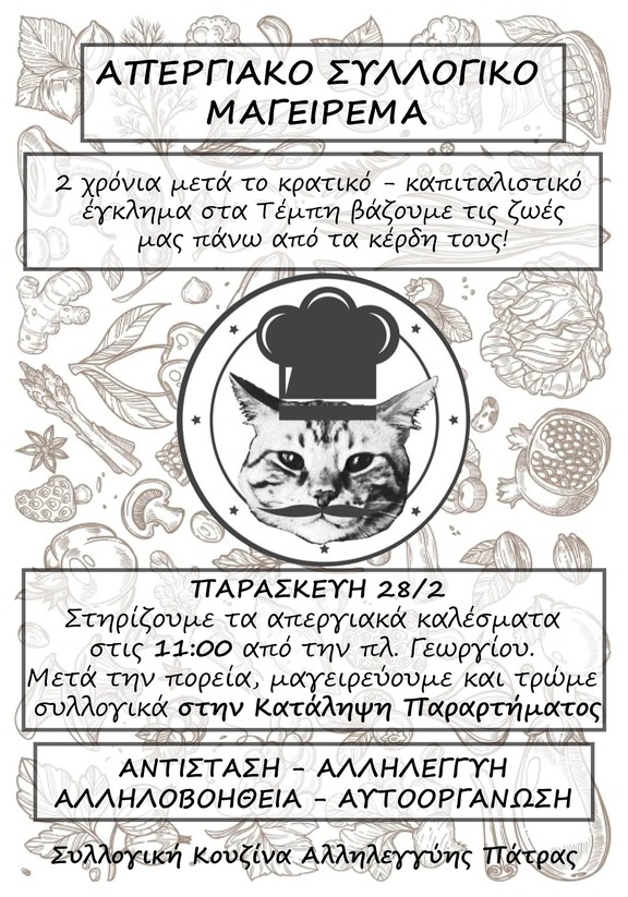 ΑΠΕΡΓΙΑΚΟ ΜΑΓΕΙΡΕΜΑ ΓΙΑ ΤΟ ΚΡΑΤΙΚΟ-ΚΑΠΙΤΑΛΙΣΤΙΚΟ ΕΓΚΛΗΜΑ ΣΤΑ ΤΕΜΠΗ