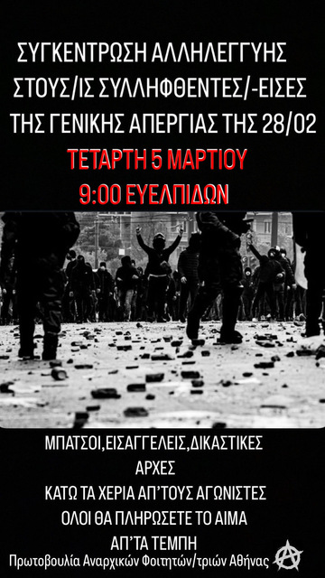 In 28/2 we experienced one of the biggest strike gatherings in the last decades that was called against the murder and cover up of the Tempi case. Despite the constant (which is a common things in these situations) violence that the state used, a lot of people tried to remain in the streets by fighting back. The riots were spread through the periphary of the center, while in parallel until the night people were trying to regroup in Suntagma after every attack of the cops. These situation gives us even bigger hope for the future and are a bright line in our movement's history. We believe it is important the solidarity that a part of the people showed on the street, to become a wall of protection and solidarity that are facing prosecution and for possible prosecutions in the future. That's why we are calling for gatherings for all the three days 3-4-5 of March that people are being taken to the prosecutor.