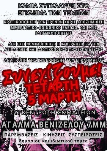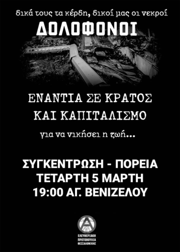 Κάλεσμα στις πανελλαδικές συγκεντρώσεις την Τετάρτη 5/3 στις 19:00 ενάντια στη συγκάλυψη και την ατιμωρησία για το κρατικό - καπιταλιστικό έγκλημα στα Τέμπη [Θεσσαλονίκη: Άγαλμα Βενιζέλου & Αθήνα: Σύνταγμα]