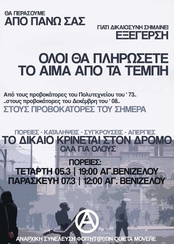 Δεν αποτελούμαστε η εξαίρεση απέναντι στην καπιταλιστική κυριαρχία που υποτιμά τους όρους διαβίωσης μας, της εργασίας μας και των σπουδών μας, για αυτό απέναντι σε αυτό το αξιακό σύστημα του κράτους και του καπιταλισμού ''ΤΑ ΚΕΡΔΗ ΤΟΥΣ ΠΑΝΩ ΑΠΟ ΤΙΣ ΑΝΘΡΩΠΙΝΕΣ ΖΩΕΣ'' '' 'Η ΕΜΕΙΣ Ή ΑΥΤΟΙ'' να γεμίσουμε τους δρόμους, τα αμφιθέατρα των Γενικών Συνελεύσεων, να κάνουμε Κατάληψη στις σχολές μας για να τις μετατρέψουμε σε Κέντρα Αγώνα.