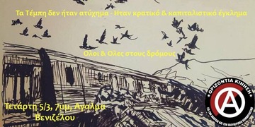 Ως ξεκάθαρο κρατικό/καπιταλιστικό έγκλημα, τα Τέμπη δεν είναι ξεκομμένα από τα λοιπά καθημερινά εγκλήματα ίδιας φύσης στους χώρους εργασίας ("εργατικά ατυχήματα"), στα υδάτινα και χερσαία σύνορα (δολοφονίες μεταναστ(ρι)ών), δεν είναι ξεκομμένα από τον πνιγμένο Θεσσαλικό Κάμπο και τα καμμένα δάση και σπίτια σε όλη την χώρα, από την Ρόδο μέχρι τον Έβρο. Υπαίτιοι είναι πάντα οι ίδιοι. Το Κράτος και το Κεφάλαιο.