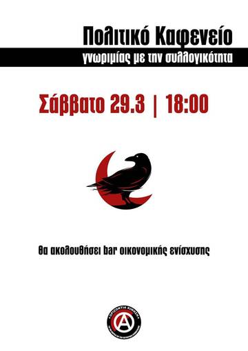 Θεωρούμε ότι η οργάνωση των αγωνιστ(ρι)ών σε ομάδες, συλλογικότητες και οργανώσεις είναι εξαιρετικά σημαντικό ζήτημα, αλλά αναγνωρίζουμε επίσης την δυσκολία - και παράλληλα την ανάγκη- αυτό να συμβαίνει με όρους πολιτικής συμφωνίας και όχι αποκλειστικά μέσω της κοινωνικής συναναστροφής. Για αυτό τον λόγο διοργανώνουμε αυτό το πολιτικό καφενείο στο Κοινωνικό Κέντρο Ovradera το Σάββατο 29/3 στις 18:00, ως ένα κάλεσμα σε ανθρώπους που έχουν παρακολουθήσει την δράση μας και θα ενδιαφέρονταν να οργανωθούν μαζί μας (σε διάφορους βαθμούς) ή έστω, σε πρώτο φάση, να μας γνωρίσουν καλύτερα και να αντιληφθούν καλύτερα τις πολιτικές μας θέσεις.