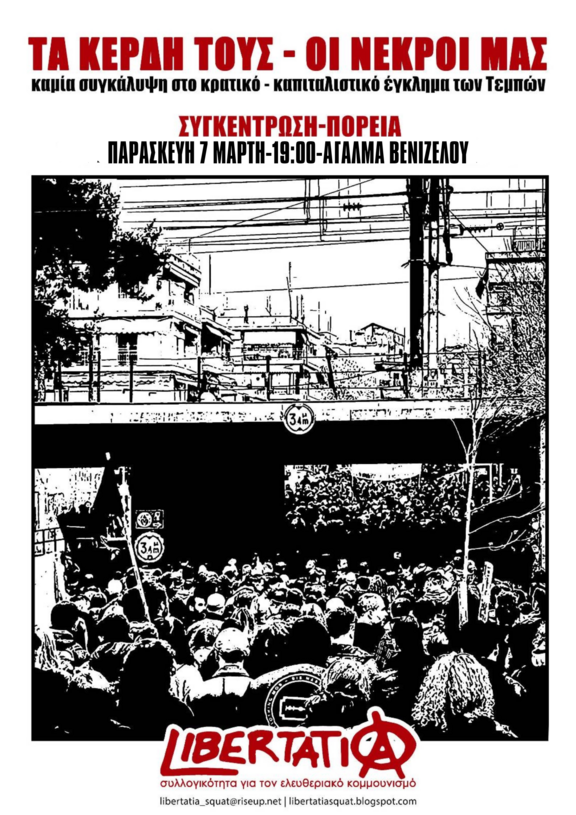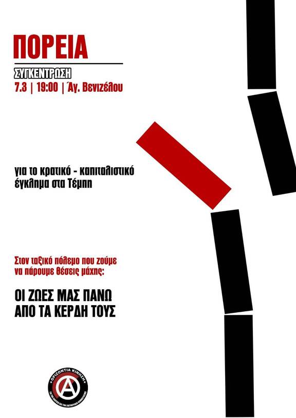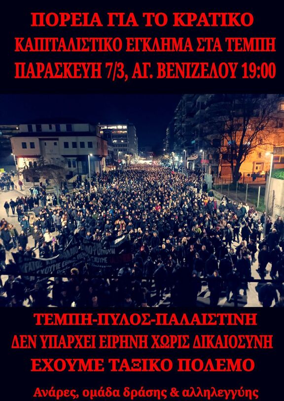 Ως ξεκάθαρο κρατικό/καπιταλιστικό έγκλημα, τα Τέμπη δεν είναι ξεκομμένα από τα λοιπά καθημερινά εγκλήματα ίδιας φύσης στους χώρους εργασίας ("εργατικά ατυχήματα"), στα υδάτινα και χερσαία σύνορα (δολοφονίες μεταναστ(ρι)ών), δεν είναι ξεκομμένα από τον πνιγμένο Θεσσαλικό Κάμπο και τα καμμένα δάση και σπίτια σε όλη την χώρα, από την Ρόδο μέχρι τον Έβρο. Υπαίτιοι είναι πάντα οι ίδιοι. Το Κράτος και το Κεφάλαιο.