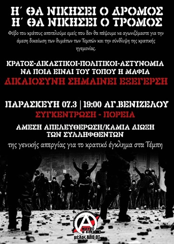 Φόβο του κράτους αποτελούμε όλοι εμείς που δεν θα πάψουμε να αγωνιζόμαστε για την άμεση δικαίωση των θυμάτων των Τεμπών και την σύνθλιψη της κρατικής ηγεμονίας. Όσο λοιπόν κράτος και αφεντικά πασχίζουν να συγκαλύψουν την εγκληματική διαχείριση τους, αρνούμενοι τις δολοφονικές ευθύνες που φέρουν στις πλάτες τους, εμείς θα βρισκόμαστε πάντα στον αντίποδα των κρατικών αφηγημάτων - υπενθυμίζοντας πως ο αγώνας για δικαιοσύνη δεν επέρχεται στις αίθουσες των δικαστηρίων. Ο αγώνας δίνεται καθημερινά στους δρόμους, με την μαζική, μαχητική συμμετοχή κάθε ανθρώπου ενάντια στο σάπιο σύστημα εξουσίας που διαχειρίζεται την ανθρώπινη ζωή ως αμελητέα. Ο αγώνας μας δεν χωράει σε κάλπες και σε κυβερνητικά προστάγματα. Ο αγώνας μας είναι δίκαιος και είναι ένας πόλεμος ενάντια στο σύγχρονο καθεστώς. Ένας αγώνας ζωής, αξιοπρέπειας, ισότητας και αλληλεγγύης.