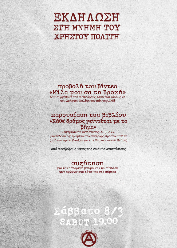 -Παρουσίαση του βιβλίου «Κάθε δρόμος γεννιέται με το βήμα»: Στιγμιότυπα αντίστασης 2013-2022. Μια έκδοση αφιερωμένη στον σύντροφο Χρήστο Πολίτη (από την πρωτοβουλία για την Επαναστατική Μνήμη)