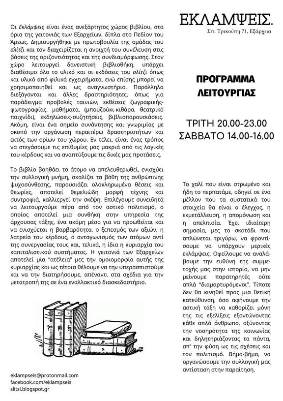 Οι Εκλάμψεις είναι αυτοδιαχειριζόμενος χώρος βιβλίου στα Εξάρχεια. Είμαστε ανοιχτά για δανεισμούς βιβλίων και κουβέντα κάθε Τρίτη 20:00-23:00 και κάθε Σάββατο 14:00-16:00.