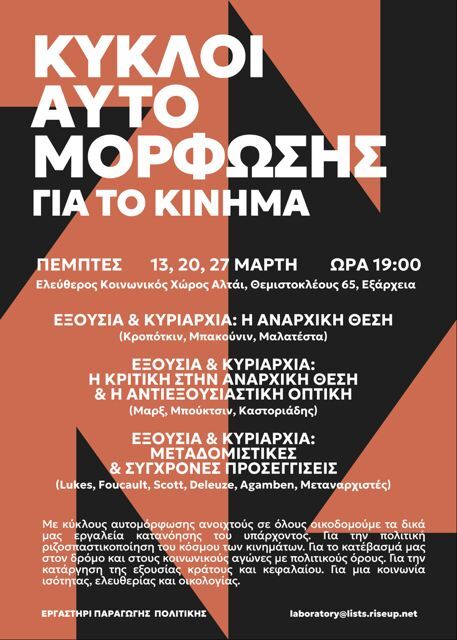 Ποια είναι η αναρχική θέση για την εξουσία και την κυριαρχία; Πως ανανεώνεται από την αντιεξουσιαστική οπτική; Ποια αξία έχουν οι σύγχρονες προσεγγίσεις στο ζήτημα; Και πως μπορούμε να κατανοήσουμε και να αναλύσουμε τον σύγχρονο κόσμο μέσα από το πρίσμα της κοινωνικής εξουσίας; Οι κύκλοι αυτομόρφωσης για το κίνημα εκκινούν με την ενότητα για την κριτική της κοινωνικής εξουσίας και της κυριαρχίας. Στους κύκλους αυτούς θα καταπιαστούμε με την αναρχική και αντιεξουσιαστική οπτική για τις σχέσεις εξουσίας με σκοπό την παροχή βασικών εργαλείων για εμάς, τους συντρόφους μας και τους συμμετέχοντες στα κοινωνικά κινήματα. Το υλικό των κύκλων θα καταγραφεί και θα διανέμεται με στόχο τη δημιουργία μίας μόνιμης δομής αυτομόρφωσης για το κίνημα.