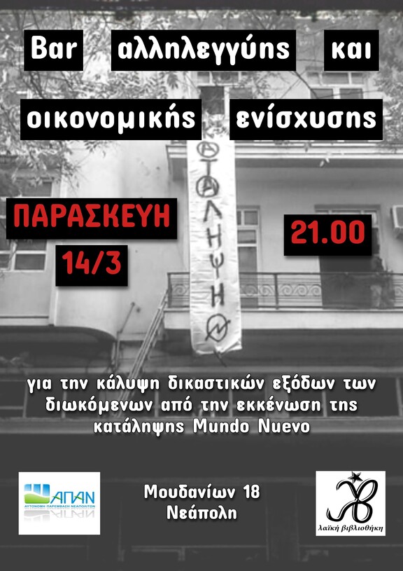Μπαρ αλληλεγγύης και οικονομικής ενίσχυσης την Παρασκευή 14 Μαρτίου στις 21.00 στο στέκι μας.