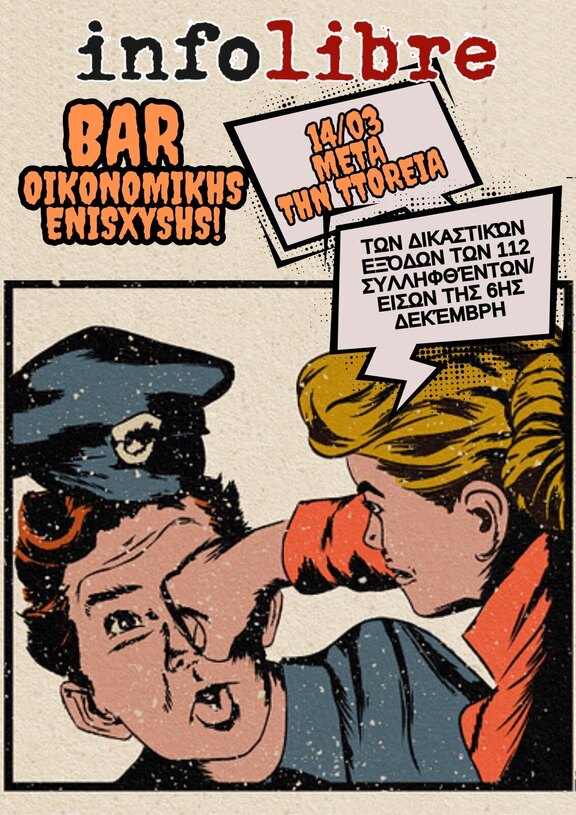 Σας προσκαλούμε στον χώρο του Infolibre σε δυνατό μπαρ για την ενίσχυση των 112 συλληφθέντων της 6ης Δεκέμβρη 2024. Το κείμενο της Συνέλευσης Αλληλεγγύης στα 112 είχε δημοσιεύσει το Infolibre, όπου παρουσιαζόταν η εκτύλιξη των πρωτοφανών γεγονότων, στο δρόμο και εντός της ΓΑΔΘ.