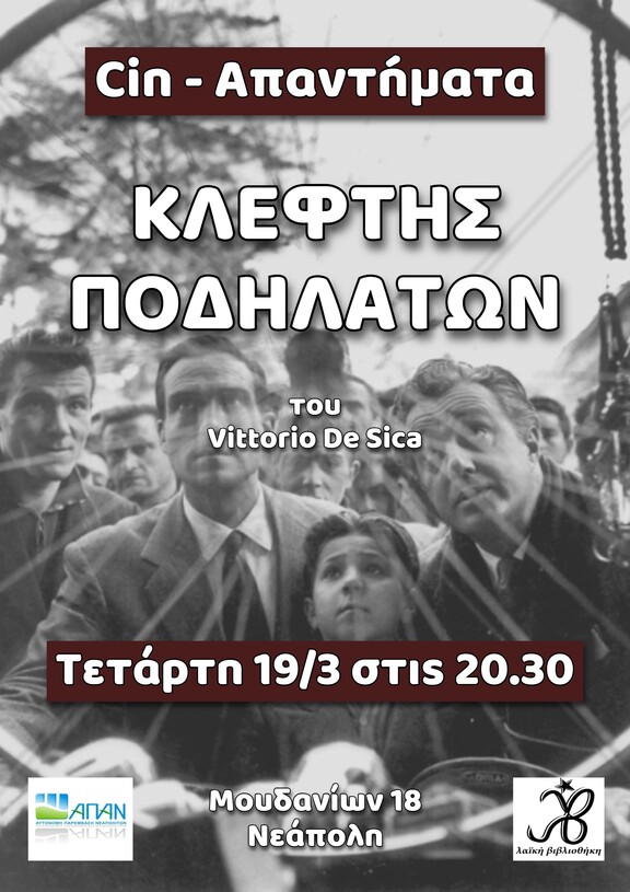 Αυτή την Τετάρτη 19/3 στις 20.30 η προβολή της ταινίας "Κλέφτης ποδηλάτων", του Vittorio De Sica.