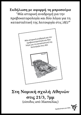 Εκδήλωση με αφορμή την μπροσούρα "Μία ιστορική αναδρομή της προβοκατορολογίας και δύο λόγια για τη κατασταλτική της λειτουργία στις 28/2", στη Νομική σχολή Αθηνών, είσοδος από Μασσαλίας.