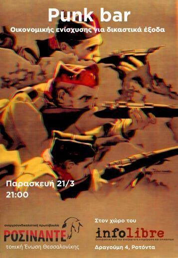 Την Παρασκευή 21/3, η Τοπική Ένωση Θεσσαλονίκης της Α.Π.Ροσινάντε διοργανώνει punk bar οικονομικής ενίσχυσης, για την κάλυψη δικαστικών έξοδων συντρόφου. Από τις 21:00 και μετά, στον χώρο του infolibre, Δραγούμη 4.