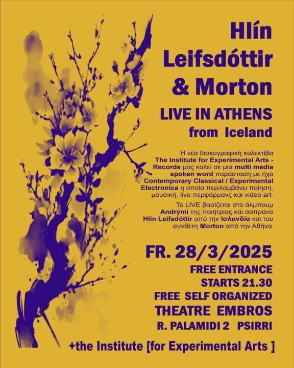 Η νέα ανεξάρτητη δισκογραφική κολεκτίβα The Institute for Experimental Arts / Records μας καλεί σε μια multi media spoken word παράσταση που περιλαμβάνει ποίηση, μουσική, live περφόρμανς και video art, βασισμένη στο άλμπουμ Andrými του ντουέτου Hlín Leifsdóttir & Morton από την Ισλανδία. Ένα ντουέτο Spoken Word με ήχο Contemporary Classical / Experimental Electronica, μια συνεργασία του Αθηναίου Morton, γνωστού και ως Whodoes, με την Ισλανδή ποιήτρια και τραγουδίστρια κλασικής και σύγχρονης μουσικής Hlín Leifsdóttir.