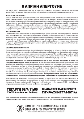 Απεργούμε γνωρίζοντας, ότι τα αφεντικά δεν έχουν σχέση με τα συμφέροντα μας. Αυτοί πλουτίζουν καθημερινά στις πλάτες μας, στις απλήρωτες υπερωρίες, στα μαύρα μεροκάματα, στα εξαντλητικά ωράρια. Δεν απεργούμε λοιπόν μαζί με τα αφεντικά, αλλά ενάντια στα αφεντικά.