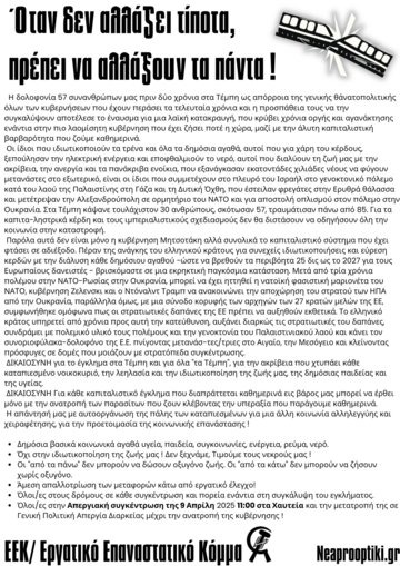 Μετά τις μεγάλες κινητοποιήσεις του Φλεβάρη και του Μάρτη που προκλήθηκαν από την ανάδειξη στη δημόσια σφαίρα των συνθηκών μέσα από τις οποίες συνέβη το κρατικό/καπιταλιστικό έγκλημα στα Τέμπη και των χειρισμών συγκάλυψής του, προκαλώντας ένα ρήγμα στην δυνατότητα του καθεστώτος να συνεχίζει απρόσκοπτα την πολιτική του ενάντιά μας, απεργούμε ξανά στις 9 Απρίλη και κατεβαίνουμε μαζικά στους δρόμους.