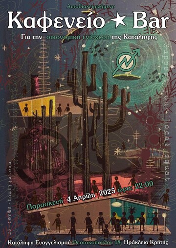 Αυτοδιαχειριζόμενο καφενείο/bar για την οικονομική ενίσχυση της Κατάληψης Ευαγγελισμού. Παρασκευή 4 Απρίλη 2025, στις 22:00 .Κατάληψη Ευαγγελισμού Θεοτοκοπούλου 18.