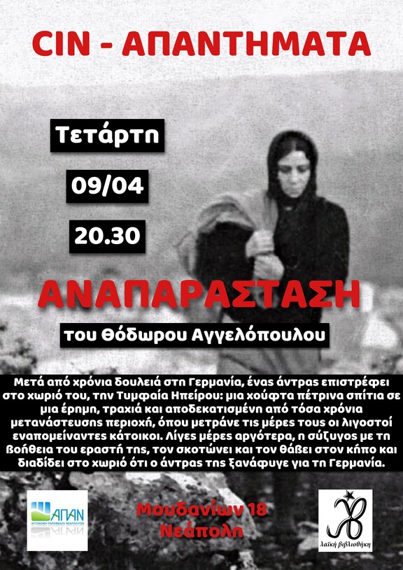 Αυτή την Τετάρτη 09/04 στις 20.30 η προβολή της ταινίας "Αναπαράσταση" του Θόδωρου Αγγελόπουλου