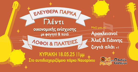 Την Κυριακή, 18 Μάη, μαζευόμαστε στο πάρκο Ναυαρίνου για μουσική, χορό, φαγητό και ποτό, ενισχύοντας τη συνέλευσή μας και περνώντας συλλογικά καλά.