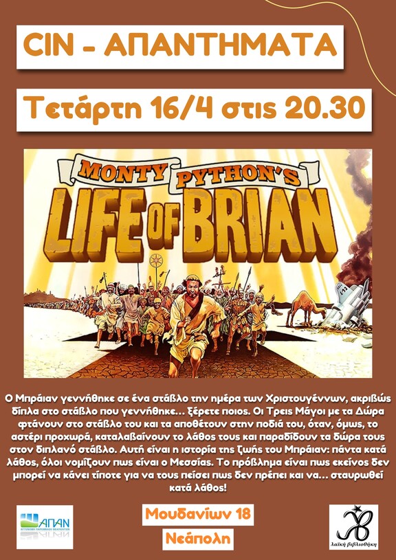 Αυτήν την Τετάρτη 16/4 στις 20.30 η προβολή της ταινίας Life of Brian των Monty Python!