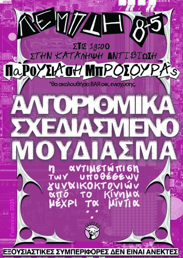 Παρουσίαση μπροσούρας "Αλγοριθμικά σχεδιασμένο μούδιασμα: η αντιμετώπιση των υποθέσεων γυναικοκτονιών από το κίνημα μέχρι τα μίντια" την πέμπτη 08/05 στις 19:00 στην κατάληψη αντιβίωση.