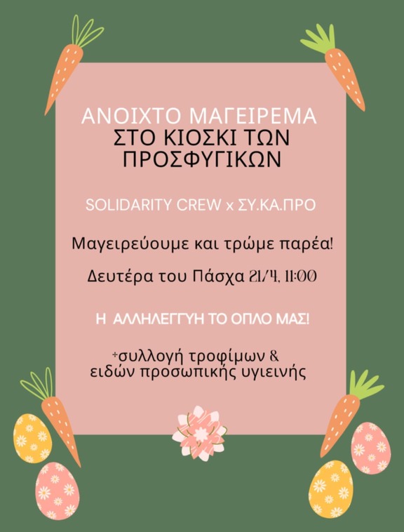 Υπό αυτό το πρίσμα αποφασίσαμε το τρίτο μας ανοιχτό μαγειρέμα να λάβει χώρα την Δευτερα του Πάσχα 21/04 στις 11:00, στο κιόσκι των Προσφυγικών.