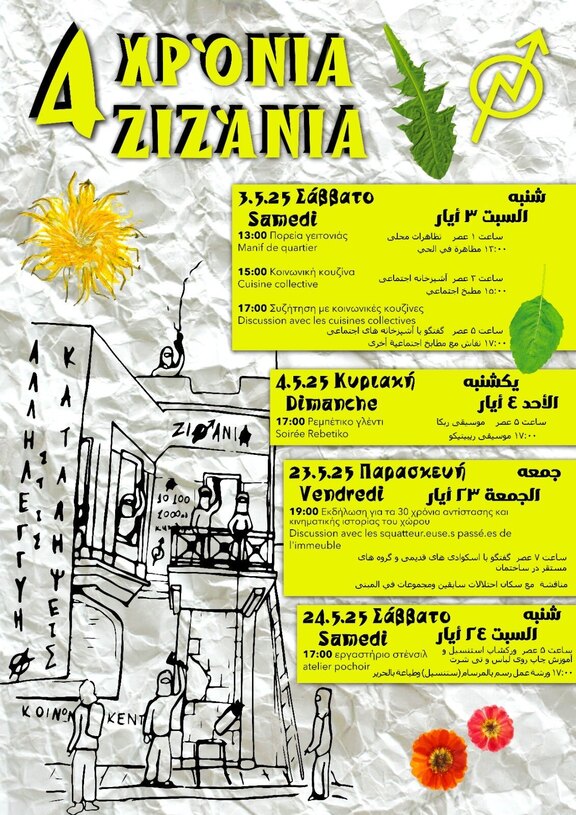 On the 3rd, 4th, and 22nd, 23rd of May, Zizania squatted social center will celebrate 4 years of existence. Despite the two evictions, we never ceased struggling for the creation of communities of solidarity and struggle in the neighborhood of Viktoria. We are still here against the fear and misery, side by side with our comrades, building a freer space, in the center of the city, in which is housed, political processes, our collective life and co-creation after 4 years. We continue to dream and build the world we want to see blossom.