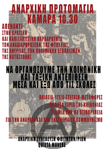 Από την μεριά μας, ως αναρχικοί/ες, οφείλουμε να πιάσουμε το νήμα των αγώνων του κινήματος και της τάξης μας και να το ξετυλίξουμε στην λογική του συνέχεια. Οφείλουμε να εμπλακούμε άμεσα - και μάλιστα στην πρώτη γραμμή- στους ταξικούς και κοινωνικούς αγώνες, χωρίς να τους ποδηγετούμε ή να τους υποκαθιστούμε. Εξασφαλίζοντας πως δεν θα μετατραπούν σε παρακολούθημα των αστικών και ρεφορμιστικών δυνάμεων, πως δεν θα γίνουν το πιόνι κανενός αρχηγού ή σωτήρα, ο,τι χρώμα λάβαρο κι αν κρατάει. Μέσω και της καλύτερης δικής μας οργάνωσης, οφείλουμε να πασχίσουμε οι αγώνες να αποκτήσουν χαρακτηριστικά ριζοσπαστικότητας και μαχητικότητας στους στόχους τους, αλλά και οριζοντιότητας και συμμετοχικότητας στην λειτουργία τους. Σε κάθε χώρο εργασίας, σε κάθε γειτονιά, στις σχολές μας, να βοηθήσουμε στην δημιουργία νέων αγώνων αλλά και δομών κοινωνικής και ταξικής αυτό-οργάνωσης, που θα προεικονίζουν τον νέο κόσμο που θέλουμε να δούμε να γεννιέται μέσα από τις στάχτες του παλιού. Όπως έλεγαν και οι σύντροφοι μας των παλαιότερων χρόνων: Φτιάχνουμε εναν νέο κόσμο μέσα στο κέλυφος του παλιού.