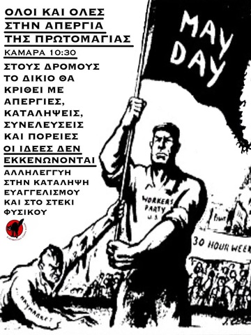 Η 1η Μαΐου είναι Απεργία και όχι αργία. Την ημέρα της Εργατικής Πρωτομαγιάς τιμούμε τους αγώνες της παγκόσμιας εργατικής τάξης για έναν καλύτερο κόσμο, ελεύθερο, χωρίς καταπίεση και εκμετάλλευση. Με αφορμή την μάχη για την κατάκτηση του 8ωρου, πιάνουμε το νήμα των αγώνων που έδωσαν και συνεχίζουν να δίνουν οι εργαζόμενοι/ες όλων των χωρών απέναντι στο Κεφάλαιο και τα Κράτη που το υπηρετούν.