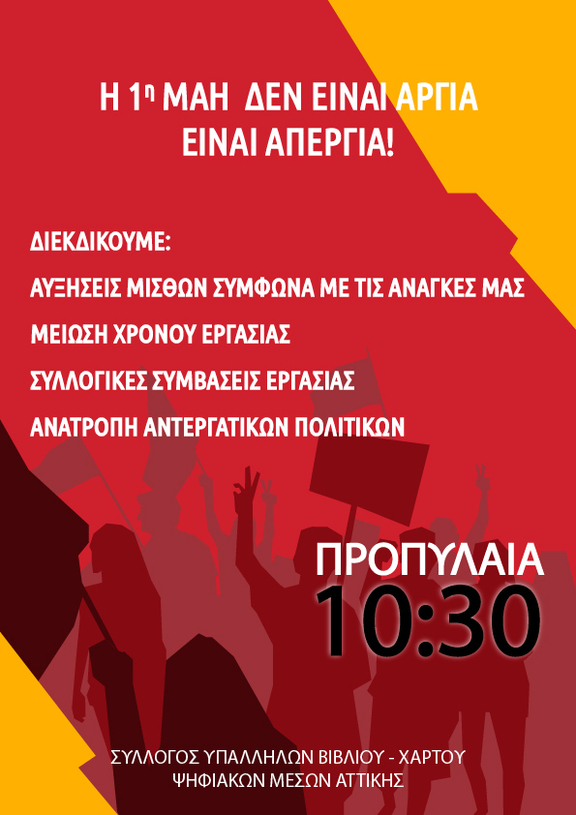 Στον δρόμο των νεκρών εργατών του Σικάγο, του Μάη του '36, της Καισαριανής. Στον δρόμο της συλλογικής πάλης και της αλληλεγγύης, για ειρήνη, ψωμί, δουλειά, δικαιώματα, ελευθερία.