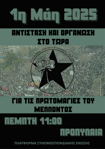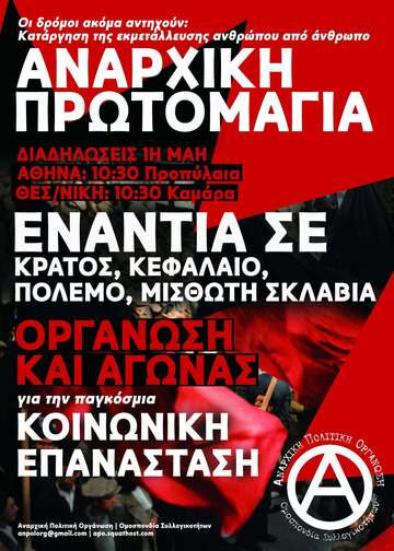 Η οργανωμένη και περιφρουρημένη παρουσία την Πρωτομαγιά είναι μια δήλωση δέσμευσης και αλληλεγγύης, σε όσους και όσες βρίσκονται και θα βρεθούν στο πλάι μας και σε αυτούς και αυτές που θα βρεθούν στον δρόμο την ίδια μέρα ανά τον κόσμο, στα εκατομμύρια που καταπιέζονται κάτω από την μπότα των εθνών - κρατών και του κεφαλαίου. Κόντρα στην αποδοχή και την εσωτερίκευση της ήττας, να χαράξουμε τον δρόμο μας και να συγκροτήσουμε συλλογικά και σε οργανική ενότητα τους μάχιμους πόλους αντίστασης που θα δώσουν προοπτική στους αγώνες μας την επόμενη περίοδο. Είναι αναπόσπαστο κομμάτι της ευθύνης που θα σηκώσουμε από κοινού, της θέσης μάχης ενάντια στο παγκόσμιο καθεστώς των κυρίαρχων ελίτ και των μηχανισμών τους που γεννούν πολέμους, γενοκτονίες, φτώχεια και εξαθλίωση σε όλους εμας.