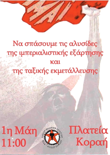 Η Πρωτομαγιά θα συμβολίζει πάντα μια από της ύψιστες στιγμές της ταξικής πάλης της σύγχρονης ιστορίας των καταπιεσμένων, της σύγκρουσης με την μισθωτή σκλαβιά, την ριζοσπαστική και επαναστατική κάθοδο ατους δρομους, των εργαζομένων, των ανέργων, των μεταναστριών, της νεολαίας, των κάθε λογής καταπιεσμένων στους δρόμους, διεκδικώντας μια ζωή με αξιοπρέπεια και ελευθερία. Ο ταξικός πόλεμος στους χώρους που ζούμε, που δουλεύουμε, που οργανωνόμαστε μας οδηγεί στο να βρεθούμε και να ξαναβρεθούμε στους δρόμους, στα οδοφράγματα της κοινωνικής αντίστασης, να ανταποδώσουμε την καταπίεση που δεχόμαστε, να πάρουμε εκδίκηση για τους δολοφονημένους μας.