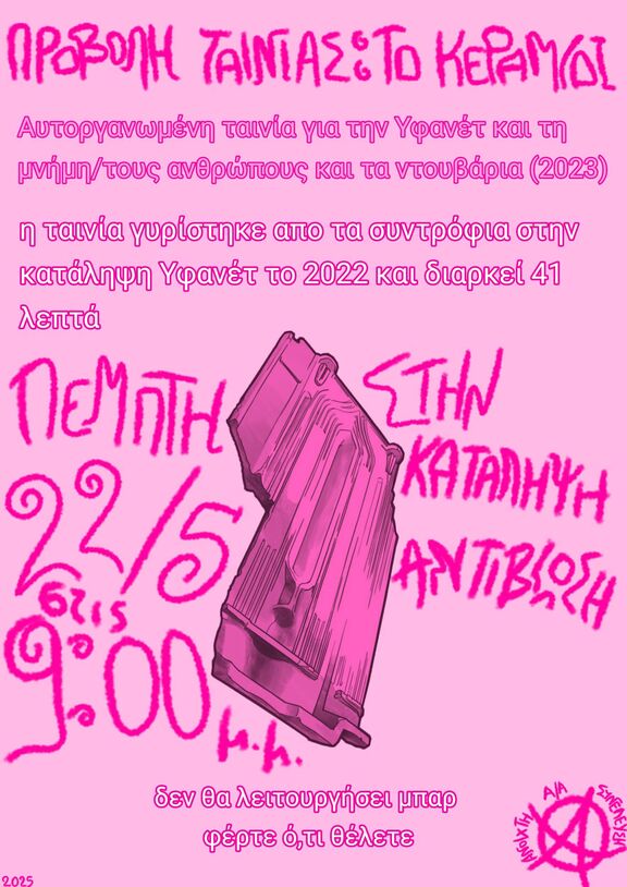 Την Πέμπτη 22/5 στις 9 μ.μ. η Ανοιχτή αναρχική/αντιεξουσιαστική συνέλευση προβάλλει με χαρά την αυτοοργανωμένη ταινία "Κεραμίδι" γυρισμένη από τα συντρόφια της κατάληψης Φάμπρικα Υφανέτ το 2022. Αν ο καιρός είναι καλός, η προβολή θα γίνει θερινή.
