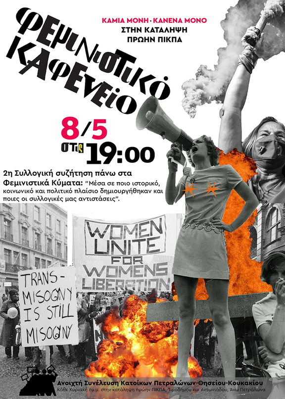 Φεμινιστικό Καφενείο την Πέμπτη 8 Μάη 2025 στις 7μ.μ. στην κατάληψη πρώην ΠΙΚΠΑ. Δεύτερη συλλογική συζήτηση, πάνω στα κύματα του φεμινισμού. Μέσα σε ποιο ιστορικό, κοινωνικό και πολιτικό πλαίσιο δημιουργήθηκαν και ποιες οι συλλογικές μας αντιστάσεις.