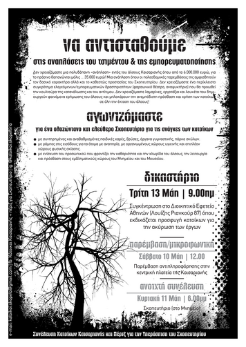 -σε μια ανάπλαση που θέλει το Σκοπευτήριο «πολιτιστικό κέντρο» και ανατρέπει την ελεύθερη χρήση και πρόσβαση στο άλσος οργανώνοντας στον πυρήνα του ένα περίκλειστο συγκρότημα ελεγχόμενων/ εμπορευματικών δραστηριοτήτων (θέατρο, αναψυκτήριο) που θα προωθεί την κουλτούρα της κατανάλωσης και του αντίτιμου, της ελεγχόμενης πρόσβασης και χρήσης.