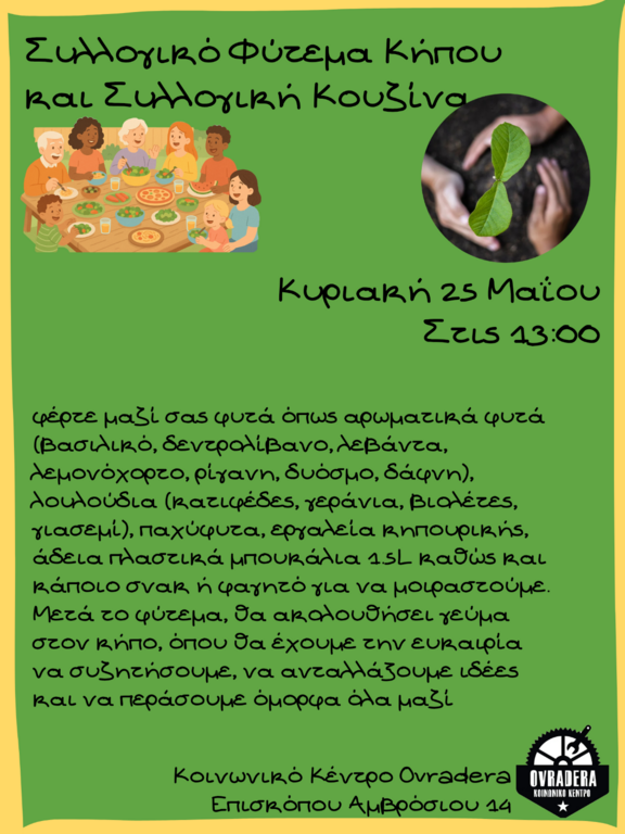Για να μπορέσει να λειτουργήσει και να αναπτυχθεί ο κήπος όπως τον οραματιζόμαστε, χρειαζόμαστε και τη δική σας συμμετοχή και υποστήριξη και θα θέλαμε ο χώρος αυτός να αποκτήσει αντίκτυπο στην ευρύτερη γειτονιά και κοινότητα γύρω από το Ovradera. Γι' αυτό, σας καλούμε να γνωριστούμε και να περάσουμε χρόνο μαζί στον κήπο στην πρώτη μας ανοιχτή συνάντηση, που θα γίνει την Κυριακή 25/5 στη 13:00. Την ημέρα αυτή θα ανοίξουμε τον χώρο και θα ξεκινήσουμε συλλογικά το φύτεμα φυτών και βοτάνων. Η προσπάθεια να δημιουργήσουμε έναν προσβάσιμο και ασφαλή χώρο για όλους βρίσκεται ακόμα σε αρχικό στάδιο, γι' αυτό θα εκτιμούσαμε ιδιαίτερα την υποστήριξή σας. Αν μπορείτε, φέρτε μαζί σας φυτά όπως αρωματικά φυτά (βασιλικό, δεντρολίβανο, λεβάντα, λεμονόχορτο, ρίγανη, δυόσμο, δάφνη), λουλούδια (κατιφέδες, γεράνια, βιολέτες, γιασεμί), παχύφυτα, εργαλεία κηπουρικής, άδεια πλαστικά μπουκάλια 1.5L καθώς και κάποιο σνακ ή φαγητό για να μοιραστούμε. Μετά το φύτεμα, θα ακολουθήσει γεύμα στον κήπο, όπου θα έχουμε την ευκαιρία να συζητήσουμε, να ανταλλάξουμε ιδέες και να περάσουμε όμορφα όλα μαζί. Σας περιμένουμε, ώστε να μπορέσουμε να μοιραστούμε τον κήπο και το όραμα που δημιουργήθηκε γύρω του!