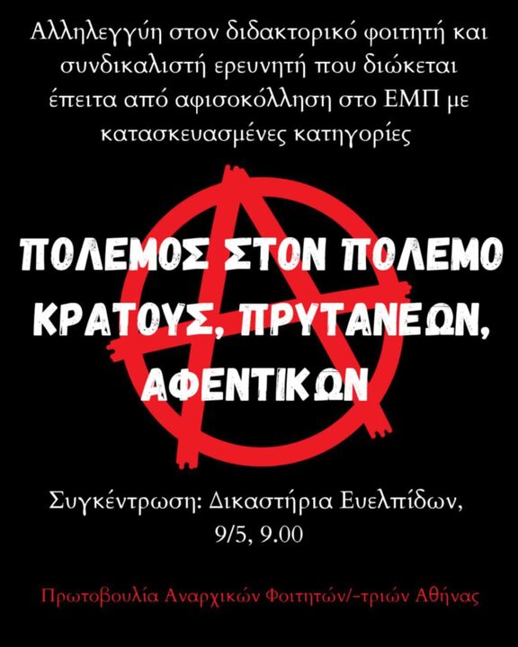 Για άλλη μια φορά η Πρυτανική αρχή του ΕΜΠ στοχοποιεί αγωνιστές οι οποίοι υψώνουν την φωνή τους απέναντι στον επιβαλλόμενο ολοκληρωτισμό. Αυτή την φορά στο στόχαστρο της κατασταλτικής εκστρατείας που έχει εξαπολύσει ο Χατζηγεωργίου προς το σύνολο της κοινότητας του ιδρύματος, βρέθηκε διδακτορικός φοιτητής και συνδικαλιστής, έπειτα απο συκοφαντικές και κατασκευασμένες κατηγορίες που εξαπέλυσε ιδιώτης - στην οποία χαρίστηκε με απευθείας ανάθεση το κυλικείο που αντικατέστησε το Αυτοδιαχειριζόμενο Κυλικείο Μηχανολόγων - με αφορμή αφισοκόλληση έξω από τον πρόσφατα εκκενωμένο χώρο την Δευτέρα 5/5. Παράλληλα, ρουφιάνοι δημοσιογράφοι των καθεστωτικών ΜΜΕ δημιουργούν κλίμα τρομοκρατίας και μιλούν για δήθεν ανομία στα πανεπιστήμια υπό τις επιταγές του αφεντικού και ο κρατικός μηχανισμός μπαίνει σε πλήρη λειτουργία, ταυτοποιώντας τον συνδικαλιστή φοιτητή και συλλαμβάνοντάς τον μαζί με φιλικό του πρόσωπο. Την Τετάρτη 7/5 πέρασαν απο εισαγγελέα και ορίστηκε η δίκη για την Παρασκευή 9/5 μέχρι την οποία και κρατήθηκαν.